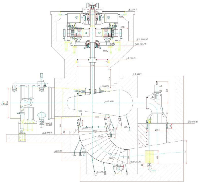 一台机发电运行时,最低尾水位 453.15m ,确定机组安装高程为 448.00m⨀ 。据尾水管体形尺寸,确定尾水管底板高程 442.80m ,厂房建基高程 440.70m ;根据蜗壳进口端尺寸及上部结构必须的混凝土厚度,确定水轮机层地面高程为452.50m ;根据水轮发电机组的尺寸、水轮机机坑进人门高度,确定发电机层地面高程为 4057.20m ;桥机轨顶高程按起吊转子所需安全高度确定为 470.20m