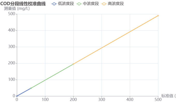 分段线性校准模型旨在解决测量曲线在不同浓度区间线性度差异问题,将测量范围划分为低浓度段(0 至 50mg/L )、中浓度段(50 至 200mg/L )和高浓度段(200 至 500mg/L )。在各浓度段内配制 5 个浓度梯度的标准溶液,进行重复测定建立校准曲线,低浓度段重点考虑仪器检出限和基线噪声影响,优化信号采集参数,中浓度段作为主要测量区间,着重提高测量精密度,高浓度段通过调节稀释比例,确保测量值落在最佳检测范围内,各浓度段过渡区域采用插值算法实现平滑过渡,定期使用标准溶液验证校准曲线,监控曲线参数稳定性 [3]。
