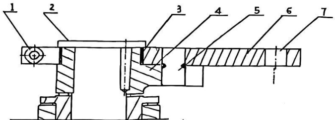 剪断销加摩擦装置组合系统,见图 1 示,系统组成:1 紧固螺栓、2 导叶端盖、3 摩擦铜环、4 活动导叶臂、5 剪断销、6 连接板、7 偏心销孔。