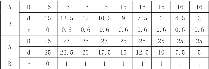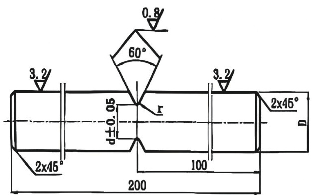剪断销材质常采用调质 45# 钢,为此我公司为提高计算面积的正确性,特意分别用 Φ15 和 φ25 两种试棒,剪断销零件设计图如图 2,按 45#调质处理与 45# 非调质两种钢材,在不同的 d/D 直径比值下进行应力集中破坏性实验,试棒的相关尺寸见表 1。