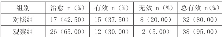 两组患者疗效对比如表1 所示,结果显示,观察组治疗总有效率高于对照组