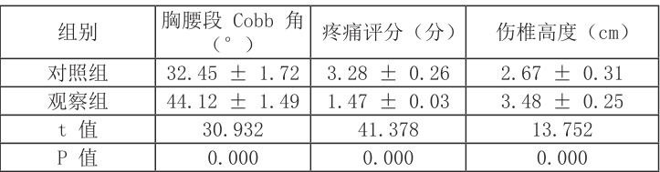 对手术效果进行评估时,选择三项临床和影像学指标,一是胸腰段Cobb 角,用于评估脊柱的弯曲程度是否得到纠正;二是VAS 评分,主要用于对患者主观疼痛程度进行衡量;三是伤椎高度,用于评估手术后受损躯体恢复情况。对这些指标进行评估时,主要在患者接受手术后的六个月,对患者的中期恢复情况进行观察。