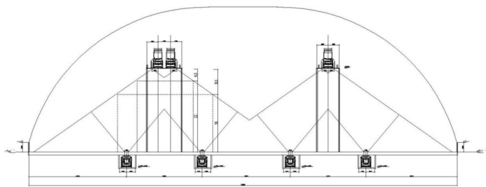 混合料堆场位于场地西北侧,现有地形高程约在 165m~230m 区间,依据总图平面规划,混合料堆场室外地坪高程为 193.50m~195.00m ,西北侧边坡高度13.5m~15.0m ,边坡坡比为 1:1.5~1.75,填方位置下部需采用挡土墙护坡。混合料堆场平面尺寸为 145m×136m (长 × 宽),设计堆料高度为 26.5m , 堆料上部设落料皮带,为钢桁架结构,维护结构采用气膜结构;堆料下部设置4 条地弄,内设出料皮带,地弄顶标高为 ±0.000m (对应高程为 193.80~195.30m ),内部净空为 5m×4m (宽 × 高)。