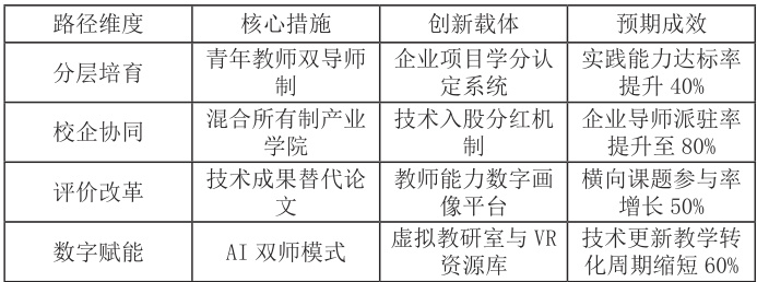 建设“双师型”教师队伍是高职院校教育系统与产业系统深度融合的一种制度化创新探索,要想解决面临的困境必须从三个方面入手。制度层面,围绕“资格认证 - 培养培训-评价激励”,形成推进《产教融合促进条例》落实落细的工作闭环。实践层面,依托企业技术项目搭建“教学 - 研发 - 服务”的教师发展一体化范式。技术层面,基于 AI 和数字孪生的优势,将产业的技术前沿能够更快地传导给教学中去。惟有将教师的双腿站稳在车间里、双手捧起职业教育的技术心脏,才能让这棵结出振兴硕果的职业教育之树茁壮成长。