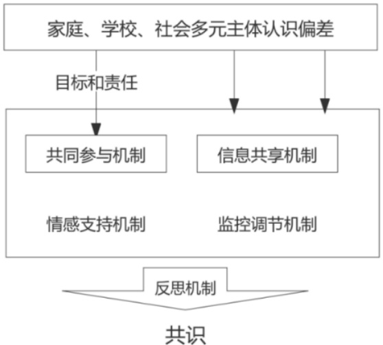 协同教育多方主体参与的基础是以学生为基础的责任和共同的目标,应当强化责任和目标意识;同时,要关注各主体差异化的诉求,让不同的诉求得到充分的表达。信息共享机制,培养多主体之间信息交流的意识,建立信息交流的平台,记录学生学习成长情况,尽量让彼此信息对等;情感支持机制,其重点在于关注建立共识过程中个体的心理和情感需求,以理解、包容、认可等态度相处,缓解个体间的心理不适,包括焦虑、抑郁和压力。监控协调机制旨在确保达成共识的质量和效果,我们鼓励三者之间一方成为交流协商的调节者,能够保证协商的进行,缓解矛盾;如只有两方,应有监控协调的意识,保证共识的顺利达成。最后通过反思机制,使多方主体达成理性的育人共识。