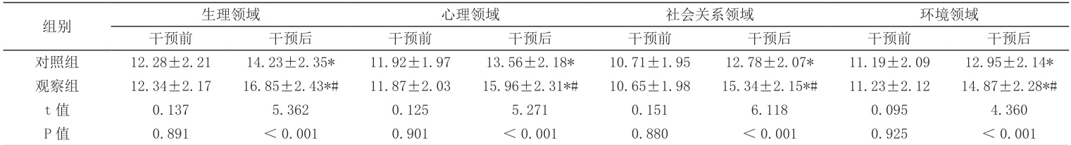 干预后,观察组患者在各维度的评分改善幅度均明显优于对照组(P <0.05),见表1。