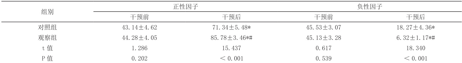 干预后,观察组患者NOSIE 正性因子评分高于对照组,负性因子评分低于对照组(P <0.05),见表2。