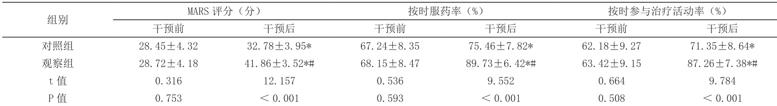 注:与同组干预前相比,*P <0.05 ;与对照组干预后相比,#P <0.05。2.3 比较治疗依从性