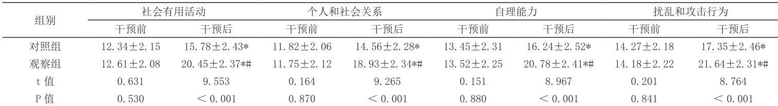 注:与同组干预前相比,*P <0.05 ;与对照组干预后相比,#P <0.05。2.4 比较社会功能评分