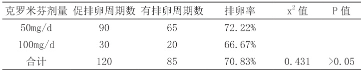 自患者月经周期或撤退性出血第 5 天起始,给予克罗米芬(上海衡山药业有限公司,国药准字 H31021107)口服治疗,单日剂量 50mg ,持续 5 日。 如患者对克罗米芬反应欠佳(卵泡直径 <10mm ),则在后续周期的第 5 天将日剂量提升至 100mg ,同样连服 5 日。完成克罗米芬疗程后,在优势卵泡直径达18mm 之际,予以肌肉注射 hCG (丽珠集团丽珠制药厂, 国药准字 H44020673)10000 单位(U),以促进卵泡排卵。