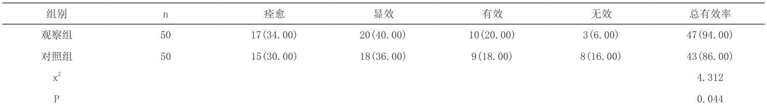 观察组总有效率高于对照组 (P<0.05) ,见表 1。