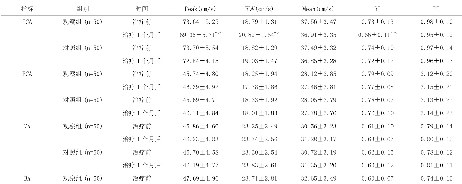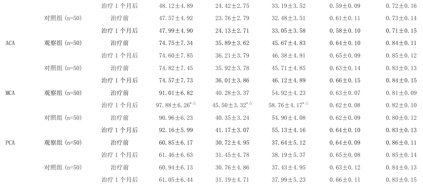 治疗 1 个月后,观察组患者 ICA 的 Peak、RI 值降低且低于对照组,EDV增加且高于对照组 (P<0.05) ;治疗 1 个月后,观察组患者 MCA 的 Peak、EDV、Mean 均增加,且高于对照组 (P<0.05) ,见表 2。