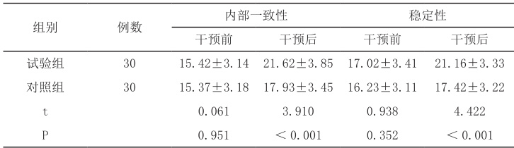 在干预后的自我概念清晰度评估中,试验组在自我概念清晰度的内部一致性和稳定性两个维度的评分均高于对照组 P<0.05 )。见表1。