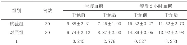 2.2 两组血糖水平比较干预后,试验组的空腹血糖和餐后2 小时血糖水平低于对照组
