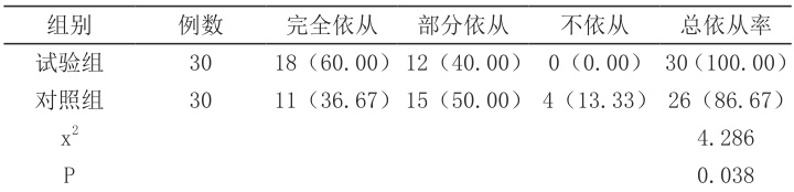 干预后,试验组的治疗依从性较对照组显著提高(P < 0.05),见表 3。