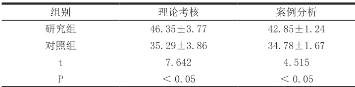 成绩结果显示,研究组学生的理论考核与案例分析成绩均更高( P<0.05 ),如表1。