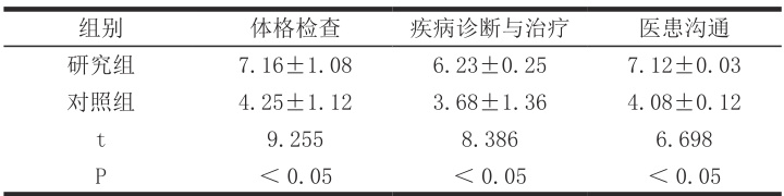 结果显示,研究组学生的三项临床演练成绩均更高(P < 0.05),如表 2。