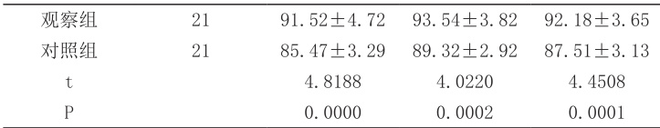 研究对象:2021.3-2024.12 期间血液学检验科接收的 42 名实习生,以带教方法的不同进行组别划分,对照组( n=21 )中有 13 名女性,8 名男性,年龄在18~34 岁之间,年龄均值为( 20.89±2.12 )岁。观察组( n=21 )中有 12 名女性,9 名男性,年龄在 19~35 岁之间,年龄均值为( 20.96±2.19 )岁。两组基础资料经系统验证, P>0.05 ,结果无差异,可进行对比。