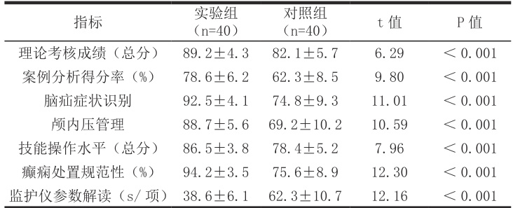 如表 1 所示,实验组在理论考核与技能操作各维度均显著优于对照组(均P<0.001)