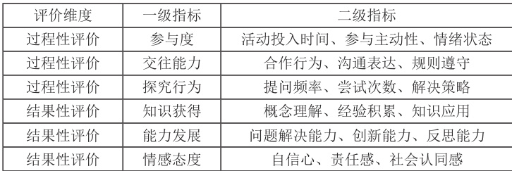 基于前述理论基础,幼儿园社会实践活动评价指标的设计主要围绕过程性评价和结果性评价两个维度展开。通过对 300 名一线幼儿园教师和 120 名学前教育专家的德尔菲法调查,结合2022 年《学前教育质量评估指南》的相关要求,本研究构建了以下评价指标体系: