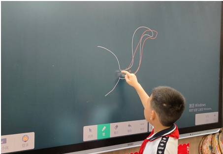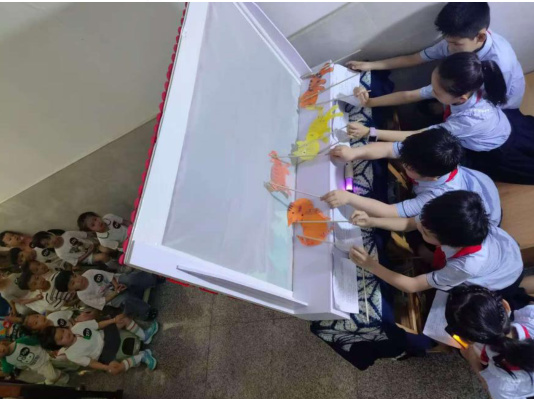 皮影故事展演构成了大单元课程中一个极具吸引力的教学环节,很多学生在幕布前进行动作预演,眼神中透露出期盼让教师都会为其动容。正式表演环节,学生们也遇到了诸多挑战,自然也修正了不少问题。以五班六组为例,该小组成员通力合作,共同设计并制作了一个有小鱼的水池,其中包含了众多栩栩如生的小鱼形象。教师最初建议仅需在池塘的背景中绘制小鱼即可。然而,学生们却持有不同意见,他们坚持要将每一条小鱼逐一剪出并进行着色。从教育者的视角来看,这一过程实际上蕴含了试错的教学理念。经过实践,学生们最终意识到,他们原先设想的做法在操作上确实存在困难,重要的是在体验整个流程后他们发现和画上去没什么差别,但却耽误了很多时间,通过这个操作过程,学生们也收获了很多。此时,教师帮他们用 502 固定几条鱼在“池塘”里,然后学生再制作一条可以活动的小鱼,在鱼塘中扮演能够跳跃的小鱼。经过这次体验,大家重新投入创作时不仅能够思考长远,同时还保障了表演的顺利进行。在表演的时候,正如学生G 说的那样,“那条小鱼游的超级愉快。