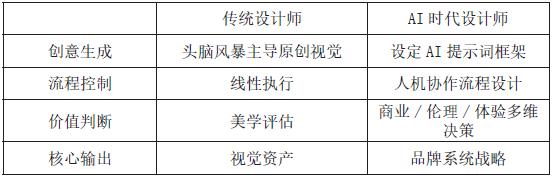 AIGC 技术为品牌设计教学带来颠覆性创新,通过工具链重组,使设计效率提升 300% 以上,动态化、个性化输出成为教学新常态。然而,技术狂欢背后潜藏双重危机,学生出现手绘能力退化、存在版权认知盲区等问题。实践证明,纯粹的技术赋能将导致设计教育异化为“提示词工程”。品牌设计教育不应抗拒 AI 替代,而需构建“人类智慧层 +AI 执行层”的协同范式,正向引导学生在明白底层设计逻辑的基础上再使用 AI 提高效率和拓展可能性,让学生不仅要知其然,更要知其所以然。教育的最高使命是守护设计的人文价值内核,这正是机器永远无法复制的圣域。AIGC 不应替代设计师的思考,而应成为验证人类创造力的镜子。唯有坚守 “设计师为主体,AI为工具” 的教育本质,方能培养出既懂技术迭代、又具人文底线的设计人才。