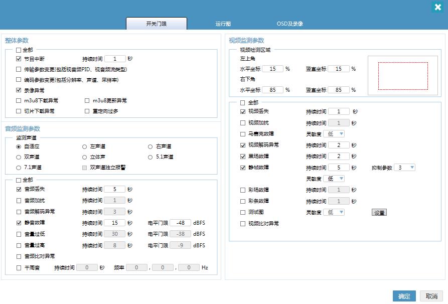 除了不同异态类型,设置报警阈值的差异外,还根据不同频道的特点调整了报警阈值。例如卫视频道作为安全级别最高的频道,异态报警阈值普遍比地面频道更加严格。购物频道经常会出现静止的正常画面,因此静帧报警阈值比其他频道更长。