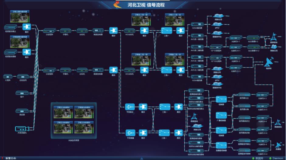电视播出中心的送下游信号包括三类:送IPTV的H.264信号、送地球站的高清上星AVS+信号和标清上星MPEG-2信号。其中H.264信号由四台哈雷编码器分发,高清上星信号通过四台AVS+编码器、微矩阵、光矩阵,分别分发微信号和光信号各两路,微矩阵和光矩阵用于信号的灵活调度,也便于设备的应急切换和日常维护。MPEG-2系统包括标清编码器、复用器,用来分发标清上星信号。电视播出中心的监控系统对分发给下游的信号进行实时监测也是非常必要的。
