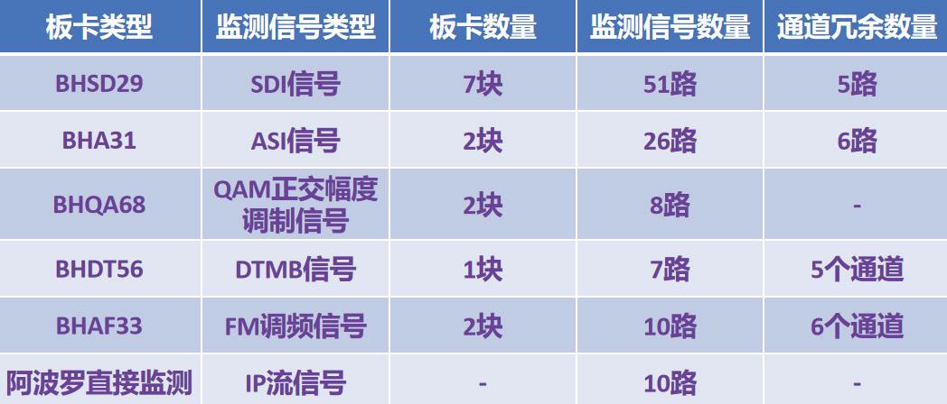 电视播出中心全高清播出机房采用HD-SDI架构,系统内部信号为无压缩的SDI信号,因此大部分需要监测的信号类型是SDI信号,由7块BHSD29监测板卡进行监测。与外部连接的解码前和编码后信号是ASI信号,由2块BHA31监测板卡监测。IP流信号的监测由阿波罗完成,采用这种方式监测的主要是H.264信号。其他需要监测的信号类型还有正交调幅QAM信号、FM调频信号和地数信号。对应板卡类型和监测负载情况如图3所列。