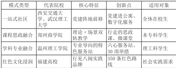 西安交通大学组建民族团结专项社区学业辅导团,将学生社区打造成为党建引领民族工作的前沿阵地;武汉理工大学在学生社区建设教育数字化体验与服务中心;金华职业技术大学全面推行“党建进公寓”,筑实“一站式”社区大思政教育新阵地。这种模式将党建阵地延伸到学生生活区,实现了“哪里有学生,哪里就有党建和思政工作”。南昌大学共青学院,组建了“一站式”服务社区,党员值班,为学生排忧解难。