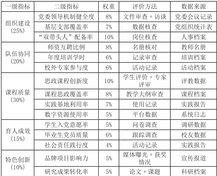 评价缺位:尚未建立科学的融合成效评价体系。当前高校评价体系中,党建与思政融合相关指标占比不足 15% ,且多关注形式而非实效。“当前高职院校党建与思政教育融合中,党建工作侧重于党员组织发展、党内事务管理,思政教育聚焦课堂教学,二者在教学内容、师资队伍、实践活动等层面缺乏系统性整合,存在‘两张皮’现象。”