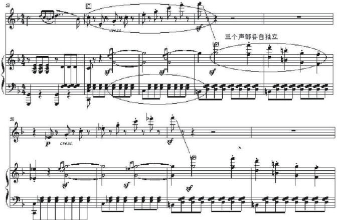 如谱例所示,该乐句中小提琴声部与钢琴双手声部共同形成三声部的重奏,这三个声部互相独立却又相互影响交融,第 54 小节小提琴声部持续的上行琶音与第 56 小节钢琴右手声部下行的八度音程琶音突显出强烈的对比,而此时的钢琴左手声部用整齐连续的八分音符形成动力感强的低声部,为旋律提供涌动力量,在协作时值得注意的是,小提琴声部将乐句推向高潮点时承接尤为重要,此时的钢琴声部要饱满、激昂,使衔接部分自然,达到昂扬乐观音乐的统一。