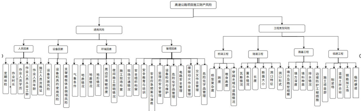 本文对与高速公路施工过程中的综合风险进行考量,对于财产风险结合公路施工的事故特点、施工流程,将施工过程中的财产风险分成通用风险、工程类型风险两大类,从人、机、环、管以及施工单元风险的特殊工艺风险进行分析,建立评价模型,为后续风险评价奠定基础。