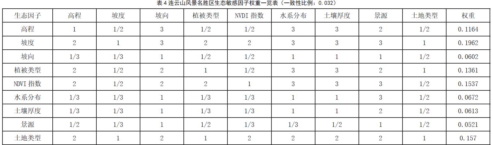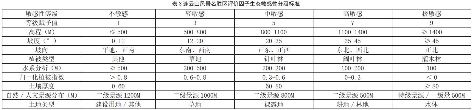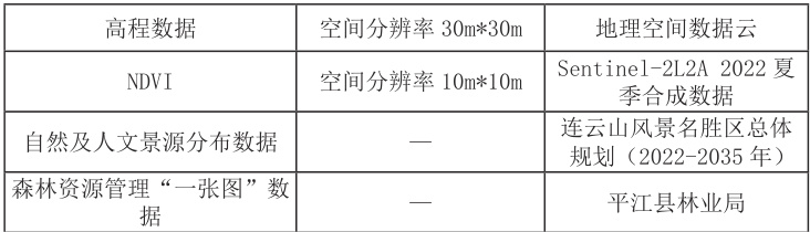 本次研究所采用数据包括连云山风景名胜区土地利用数据、高程数据(DEM)、归一化植被指数(NDVI)、连云山风景名胜区自然和人文景源位置数据、森林资源管理“一张图”数据、道路数据以及村落分布数据等,如表1。