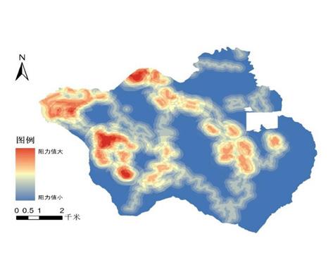 通过加权分析各阻力因子最终得到连云山风景名胜区人为活动干扰阻力综合因子。结果显示,区域北侧以及西侧区域受人为活动干扰最大,这与当地的村落积聚以及纯溪景区大量景点分布以及游览活动旺盛密不可分,此外中部区域沿沱龙峡水库一线由于受漂流活动影响,这一区域的人为干扰因素也较为强烈。