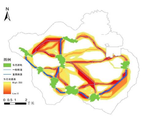 (1)生态源地。共得到 8 处生态源地,总面积约 3.89km2 ,空间分布特征明显,大致呈现西侧以及南侧集中的趋势,主要分布在纯溪与连云山主峰附近区域。