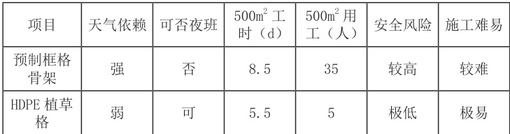 表1 :预制框格骨架与蜂巢格室(HDPE)施工条件对比