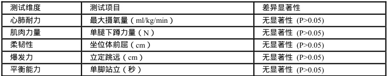 根据全面性与科学性及可操作性原则,针对心肺耐力与肌肉力量,柔韧性及爆发力与平衡能力五个维度进行测试,具体项目包括最大摄氧量(反映心肺能力),握力与背力(反映肌肉力量),髋关节屈曲角度与坐位体前屈测试(反映柔韧性),立定跳远成绩(反映下肢爆发力)以及单脚站立平衡测试[2]。使用标准化测试设备,如气体分析仪与力量测定仪及超声测量设备等,确保测试环节数据的准确性及易复现性。表 1 展示了训练前身体素质关键指标基线条件,实验组与对照组在基线均无显著差异。