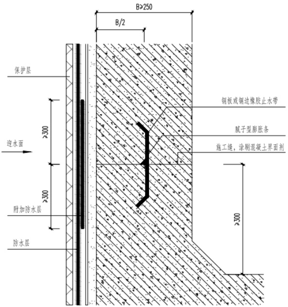 垃圾转运站地下结构施工缝渗漏,要考虑动态荷载等影响,采取多道防水措施。如图 1外墙施工缝构造,中埋式止水带与外贴式防水层配合,应对接缝的三维位移。
