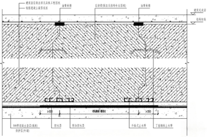 解决对策: 关于施工缝处理,在混凝土浇筑之前,用钢丝刷将表面的浮浆,松动的石子等杂物清除干净,再用高压水枪冲洗,冲洗干净之后,还要把表面充分湿润,涂刷水泥基渗透结晶型防水涂料的时候,一定要保证涂料涂刷得均匀,而且要达到设计规定的厚度,等到涂料完全干透以后,装上宽 350 毫米的钢板止水带,装的时候,止水带要居中放置,深入到两边的混凝土里各 175 毫米,用点焊的方法把它跟结构钢筋固定好,这样就能防止浇筑的时候移动。对于变形缝来说,很重要的是中埋式橡胶止水带和外贴式止水带的安装。 中埋式止水带宽 300mm ,安装时不得扭曲、褶皱,保证结构变形时止水。外贴式止水带宽 400mm ,粘贴前基层清理干净,粘贴牢固,避免脱落。穿墙管部位,管道表面防腐涂料涂刷时,保证涂刷完整,不漏刷。遇水膨胀止水圈安装,管径小于 500mm 时,止水圈厚度不小于20mm;管径大于 500mm 时,止水圈厚度不小于 30mm ,安装后用密封胶密封,保证密封严实,无遗漏缝隙。