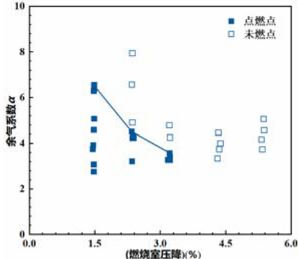由图 5 所示的点火边界线可以看出,在常温常压条件下,贫油点火余气系数随燃烧室压降的增加而逐渐减小,点火边界呈现出逐步收窄的趋势。