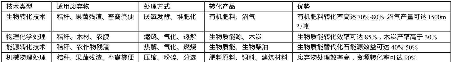 废弃农业物再利用技术通常采用生物转化、物理化学处理技术、能源转化技术、机械物理处理等技术实现废弃农业物再利用。 下表 1 是以上4 种废弃农业物再利用技术的对比,及其相关优势: