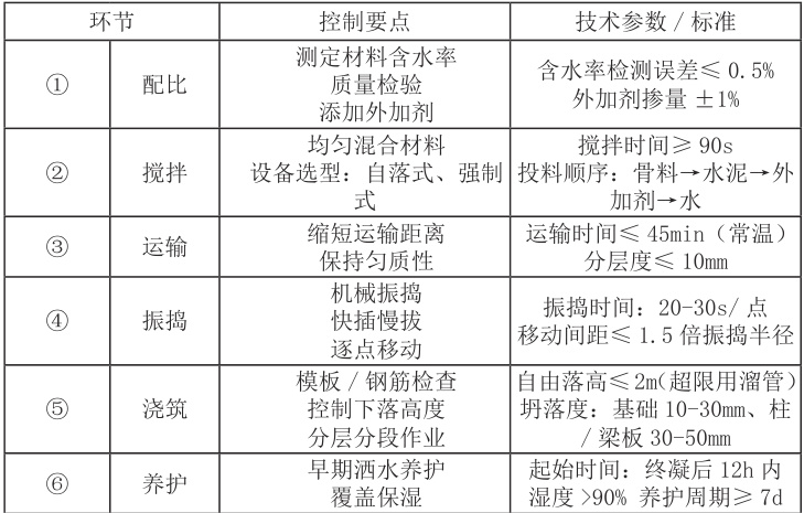 表1 混凝土施工关键环节控制要点