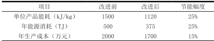 根据实施的节能技术方案,干燥过程的能效得到一定的提升,该企业年产能为 2000 吨精细化工产品,能源价格为 200 元 / GJ。表 1 展示出实施节能改进前后的能效数据对比,以及由此带来的经济效益: