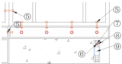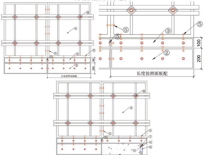 本施工技术将传统铝合金模板 K 板 ① ,优化为 200mm 高 K 板②和 100mm 高K 板③, 200mm 高 K 板②和 100mm 高 K 板③以及铝合金墙板④通过铝合金模板连接销钉 ⑤ 连接。根据现场的实际情况提前设置附着式升降脚手架预留孔 ⑥ ,浇筑完混凝土后,及时拆卸 200mm 高 K 板②和 100mm 高 K 板③之间的铝合金模板连接销钉 ⑤ 以及铝合金模板固定螺栓 ⑩ ,拆除早拆部分 200mm 高 K 板 ② ,安装附着式升降脚手架支座⑨,通过附着式升降脚手架支座螺杆⑦和附着式升降脚手架支座螺母⑧将附着式升降脚手架支座 ⑨ 固定在附着式升降脚手架预留孔⑥ 中,及时提升附着式升降脚手架。