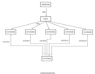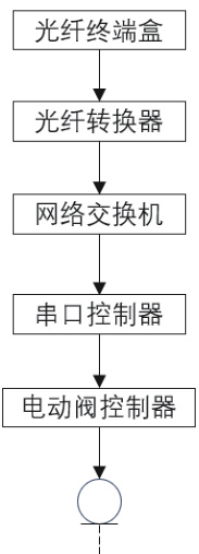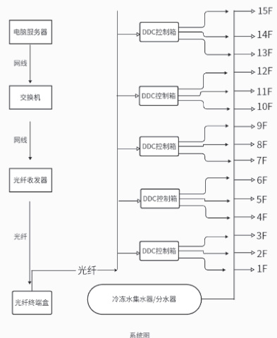 空调机组值班室电脑安装控制软件,经过网线连接交换机,经过光电转换器由网线转换为光纤到楼层光纤终端盒,然后光转电模块将光纤转换为网线,接入到串口控制模块,由串口控制模块控制管道间的冷冻水进水电动阀。