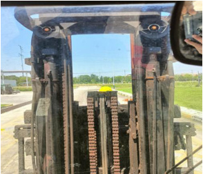 现场模拟叉车叉运料包,图 2 其他人员站在叉车的正前方一米处驾驶人员能看到头盔,图 3 驾驶人员在驾驶车辆的过程中注意力不集中。