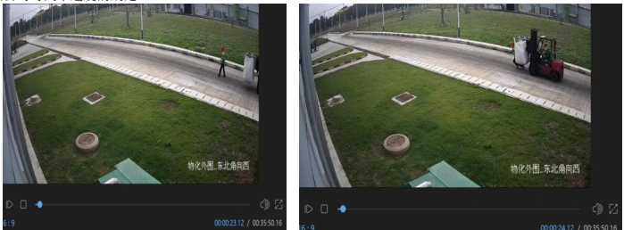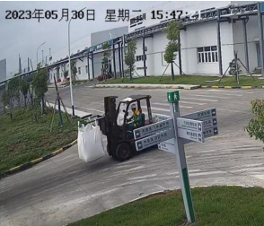 现场通过调取监控,截取出事前一段时间内的照片(见图 4、图 5)。事故中一段单独水泥路段的距离为 5米,叉车总行驶时间为 24.12-23.12=1 秒,叉车平均行驶速度为 5×60×60÷1000=18km/h 。该速度已经超过该公司对叉车速度的规定