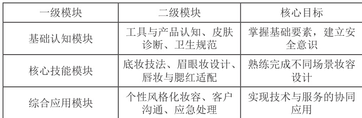 基于“基础能力—核心能力—拓展能力”的培养逻辑,将课程划分为 3个一级模块、9 个二级子模块,形成“层层递进、模块互通”的内容体系(见表 1)。并配套“理论微课 + 实操指南 + 问题库”教学资源库,例如底妆技法模块中,理论微课解析“肤质判断与粉底类型的选择”,实操指南提供“干皮 3 步保湿底妆法”“油皮 4 步持妆底妆法”的分步视频,问题库收录“卡粉/ 浮粉/ 假面”等10 类常见问题的解决方案 [5]。