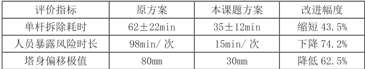 为排除偶然因素,又在 QTZ160、QTZ200 两种机型上重复实验,共完成 12 组对比试验。结果与表 1 趋势一致:单杆拆除时间平均缩短 40%~45% ;塔身偏移极值均在 30mm 以内;方差分析显示 P<0.05 ,差异具有统计学意义。